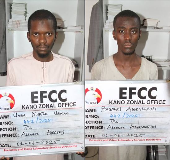 The charge reads: “That you, Buhari Abdullahi and Umar Mukhtar Usman, sometime in May 2025 at Kano within the jurisdiction of this Honourable Court, falsely impersonated investigators of the Economic and Financial Crimes Commission, EFCC, used a false identity card, and paraded yourselves as staff of EFCC, thereby committing an offence contrary to and punishable under Section 132 of the Penal Code Law.”