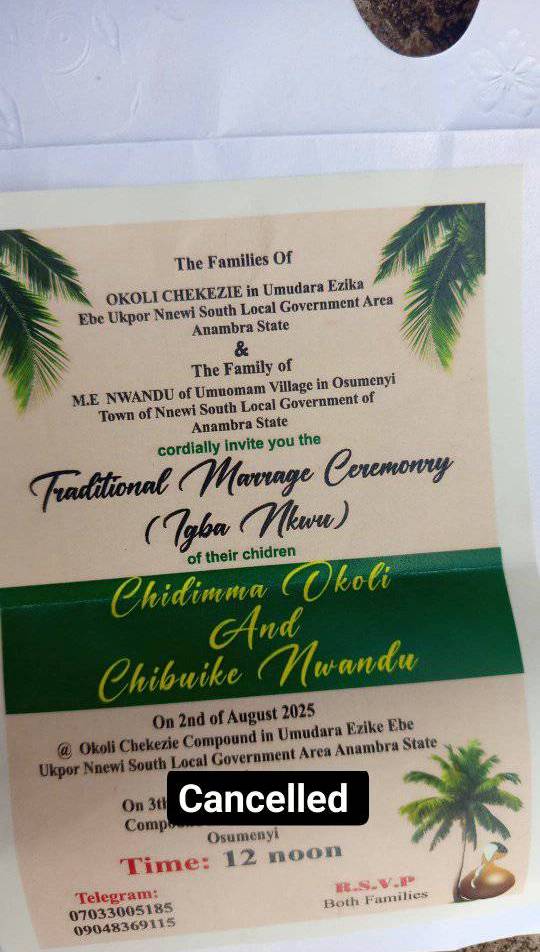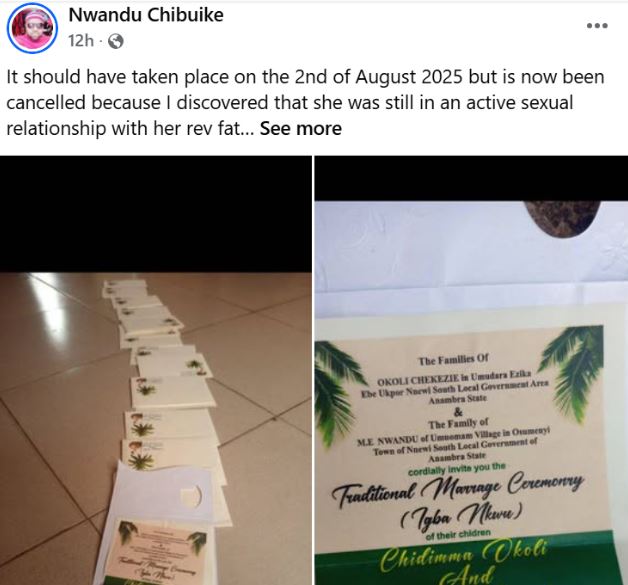 He wrote: “It should have taken place on the 2nd of August 2025 but is now been cancelled because I discovered that she was still in an active s*xual relationship with her rev father, even after the introduction, I have her confession on tape.”