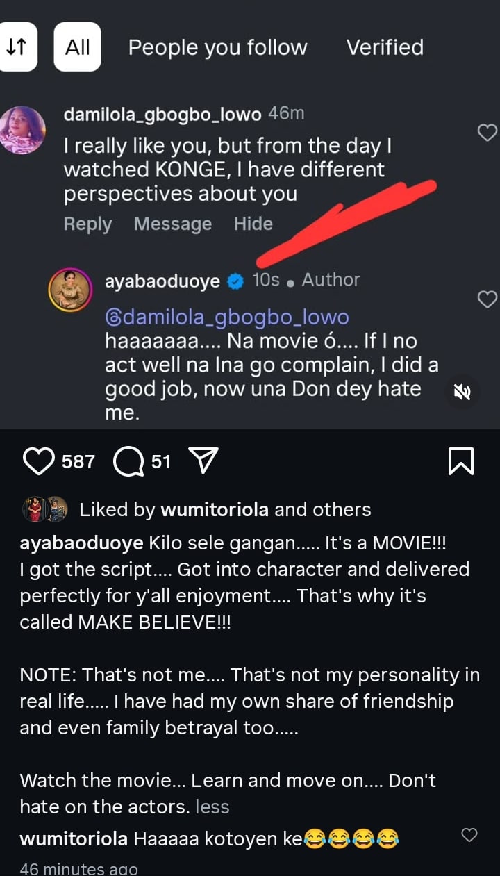 Nollywood actress Mosun Filani has given a reply to a fan who slammed her over her role in her colleague, Wumi Toriola’s new movie, Konge 3.