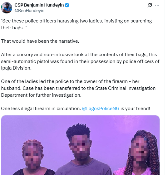 CSP Benjamin Hundeyin, who disclosed this to newsmen, mentioned that the wife and another lady were stopped by the police for a stop and search. He said the search led to the discovery of the semi-automatic pistol.