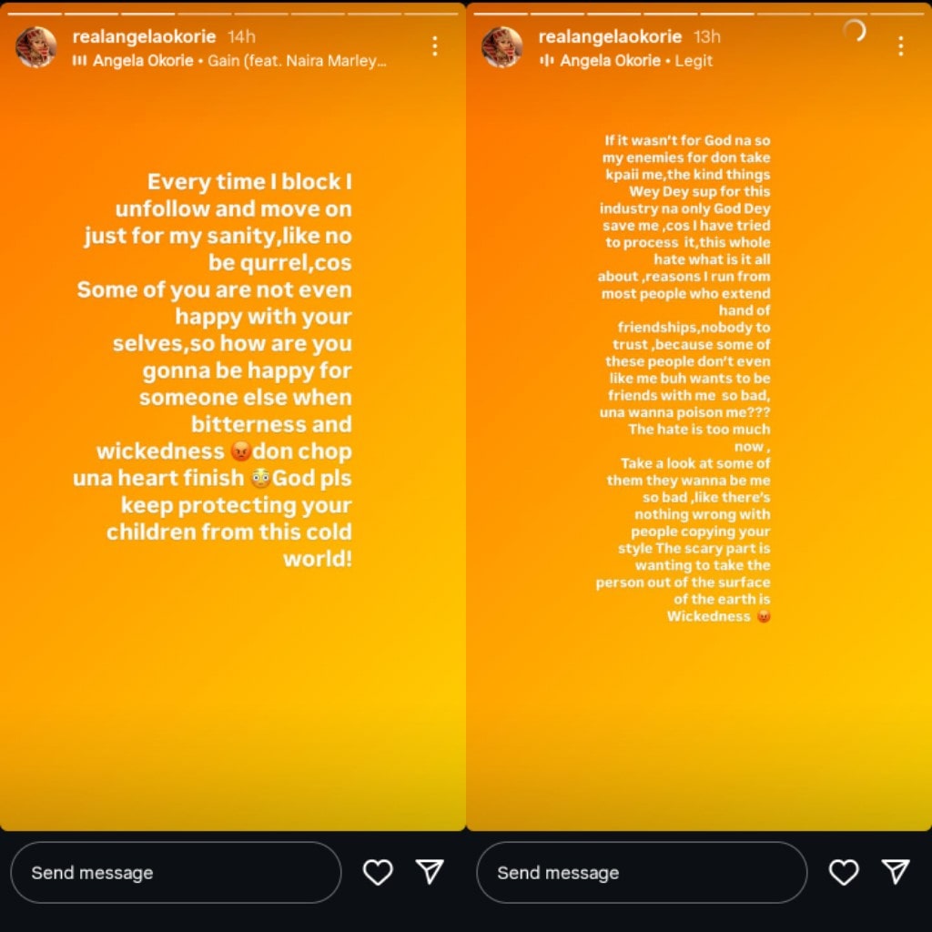 She wrote: “If it wasn’t for God na so my enemies for don take kpai me. The kind things wey dey sup for this industry na only God dey save me, cos I have tried to process it, this whole hate, what is it all about? Reasons I run from most people who extend hand of friendships, nobody to trust, because some of these people don’t even like me but what to be friends with me so bad. Una wan poison me?