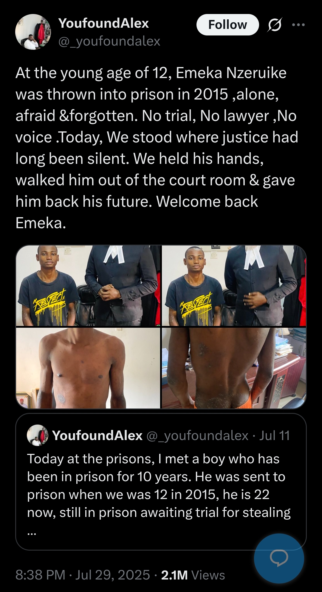 He added, “At the young age of 12, Emeka Nzeruike was thrown into prison in 2015 alone, afraid, and forgotten. No trial, no lawyer, no voice. Today, we stood where justice had long been silent. We held his hands, walked him out of the courtroom, and gave him back his future. Welcome back, Emeka.”