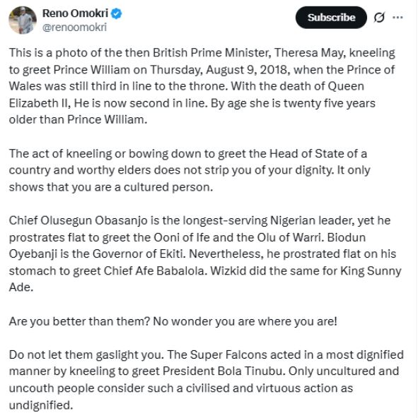 Reno Omokri has slammed Nigerians who condemned the Super Falcons for kneeling to greet President Bola Tinubu and First Lady Remi Tinubu during their visit to Aso Rock on Monday, July 28.