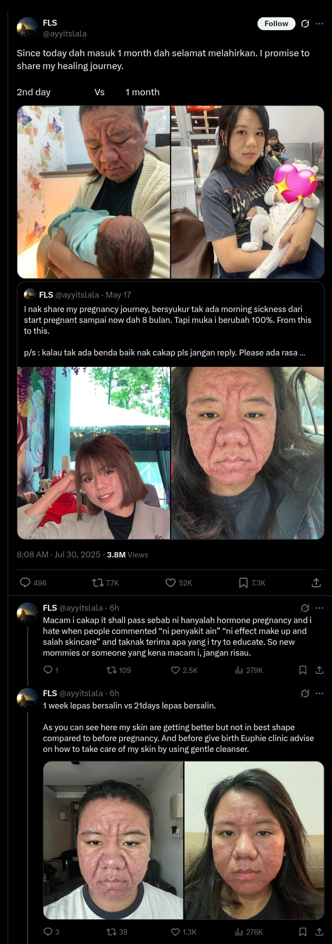 Taking to X, the lady with the handle, @ayyitslala posted her transformation with pictures, showing the physical toll pregnancy had on her skin.