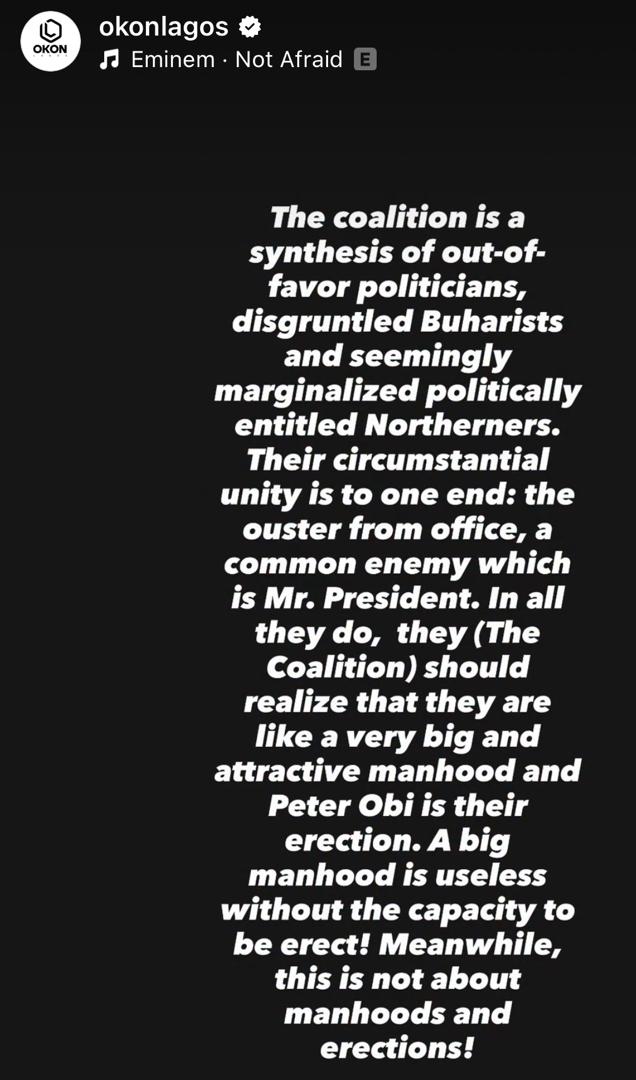 Taking to his Instastories, OkonLagos said the coalition is currently made up of out-of-favor politicians, disgruntled Buharists and seemingly marginalized politically entitled Northerners.