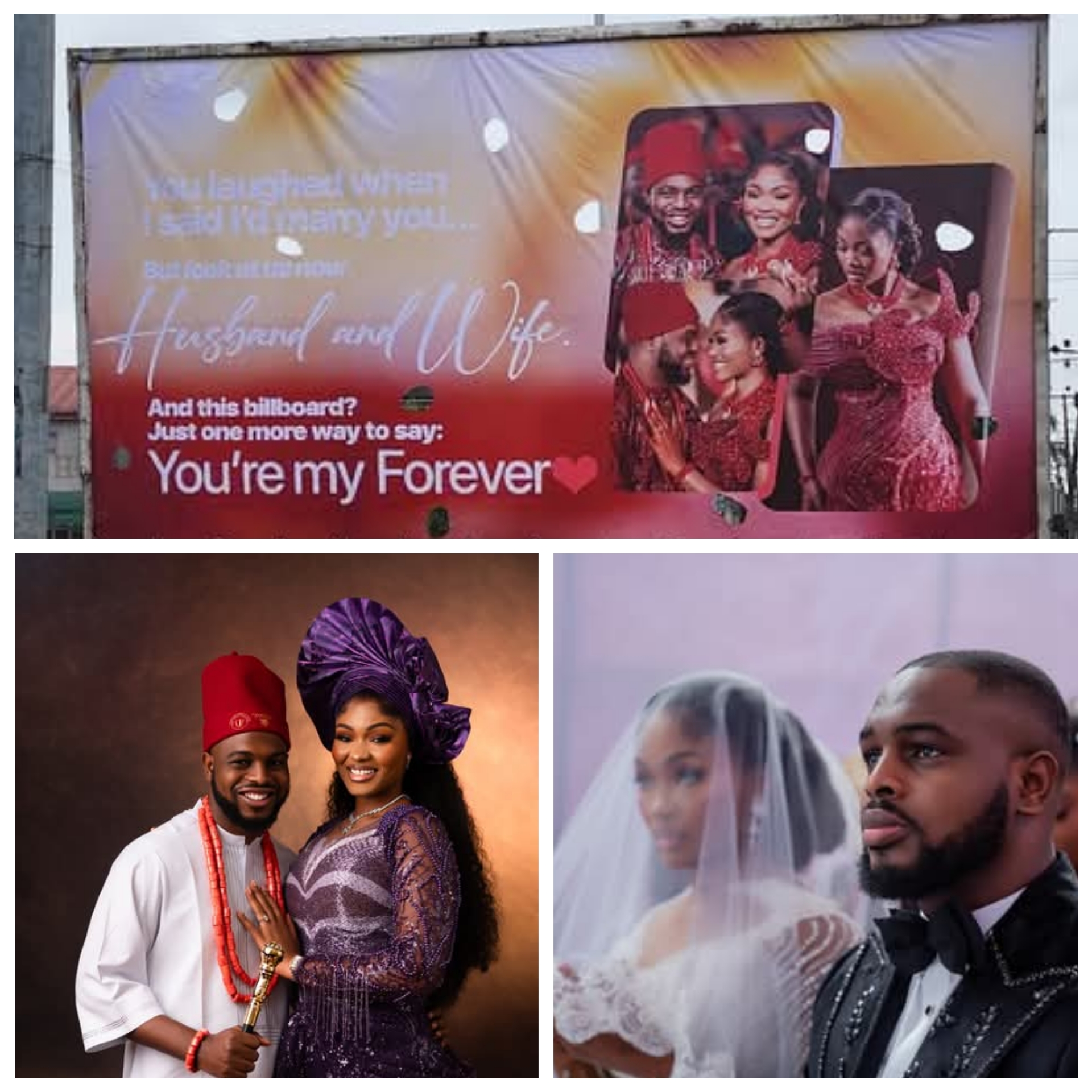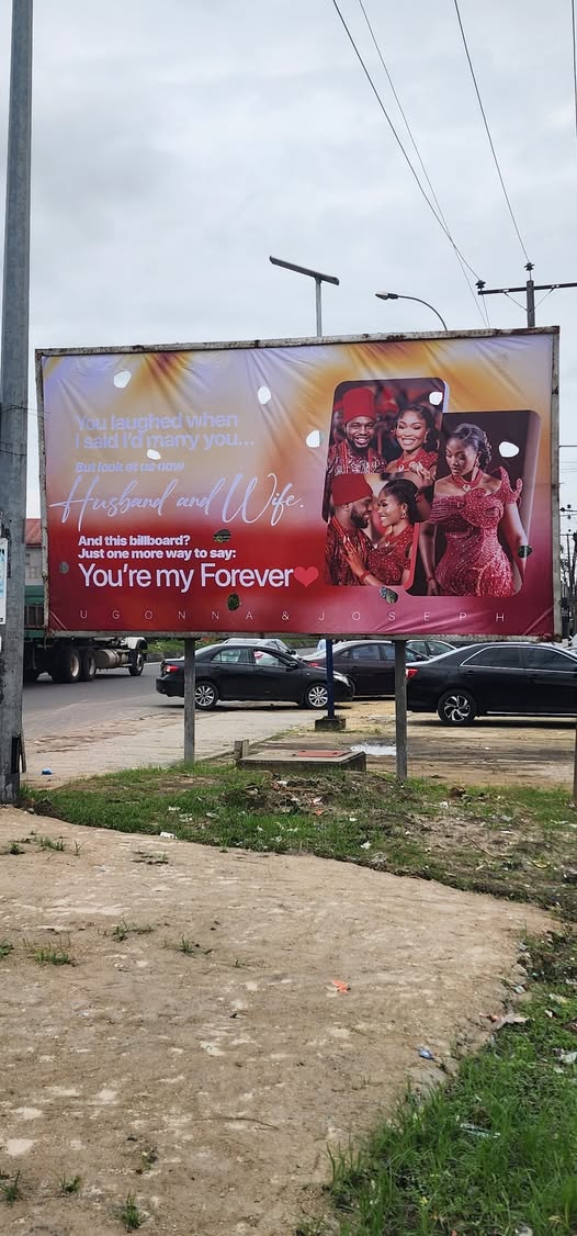 Joseph took to Facebook on Wednesday, July 30, 2025, to share a photo of the billboard, with their traditional wedding pictures, that proclaim “You are my forever”