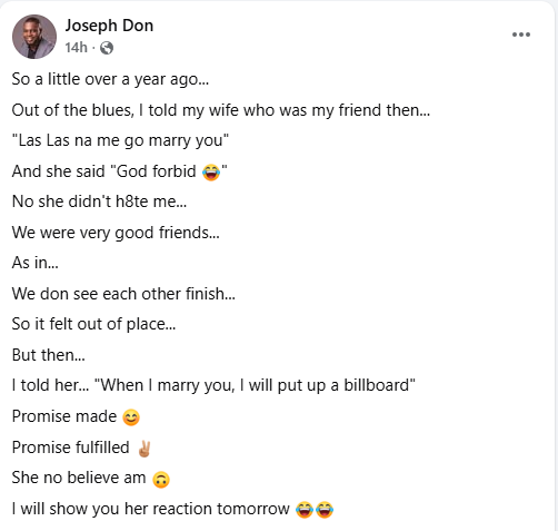 “So a little over a year ago. Out of the blues, I told my wife who was my friend then… “Las Las na me go marry you” And she said “God forbid”. No she didn't h8te me. We were very good friends. As in…We don see each other finish. So it felt out of place…But then… I told her... “When I marry you, I will put up a billboard” Promise made. Promise fulfilled. She no believe am. I will show you her reaction tomorrow,” he wrote.