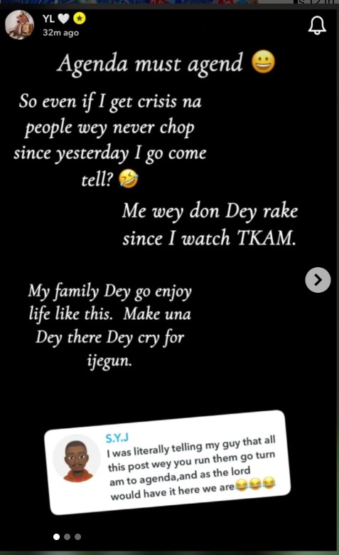 He wrote: “Agenda must agend. So even if I get crisis na people wey never chop since yesterday I go come tell? 😂 Me wey don dey rake since I watch TKAM.”