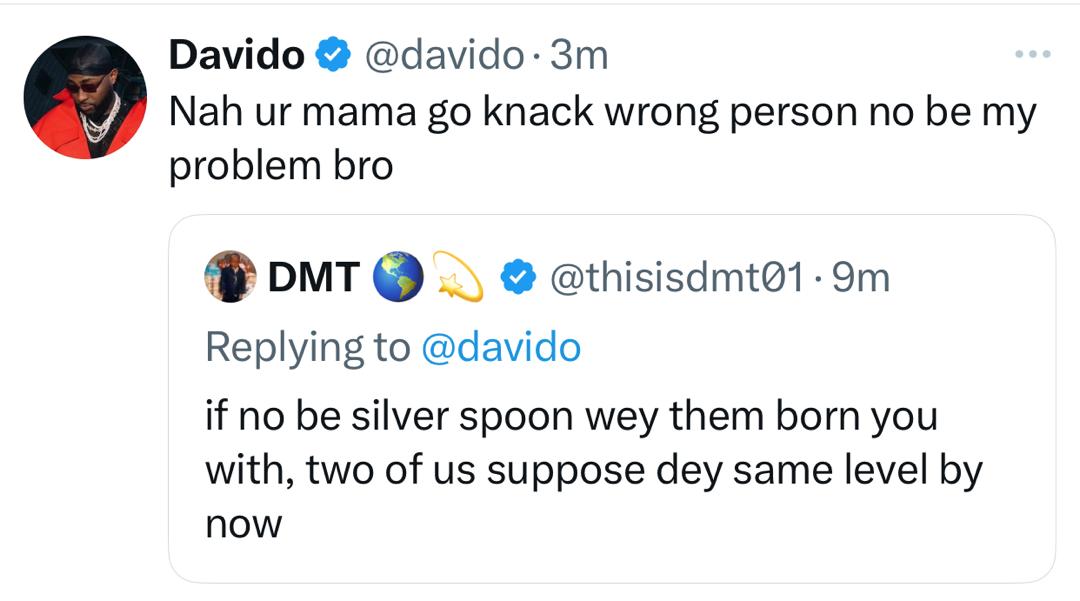 Afrobeats star, Davido has given a funny reply to X user who trolled him for being born with a silver spoon.