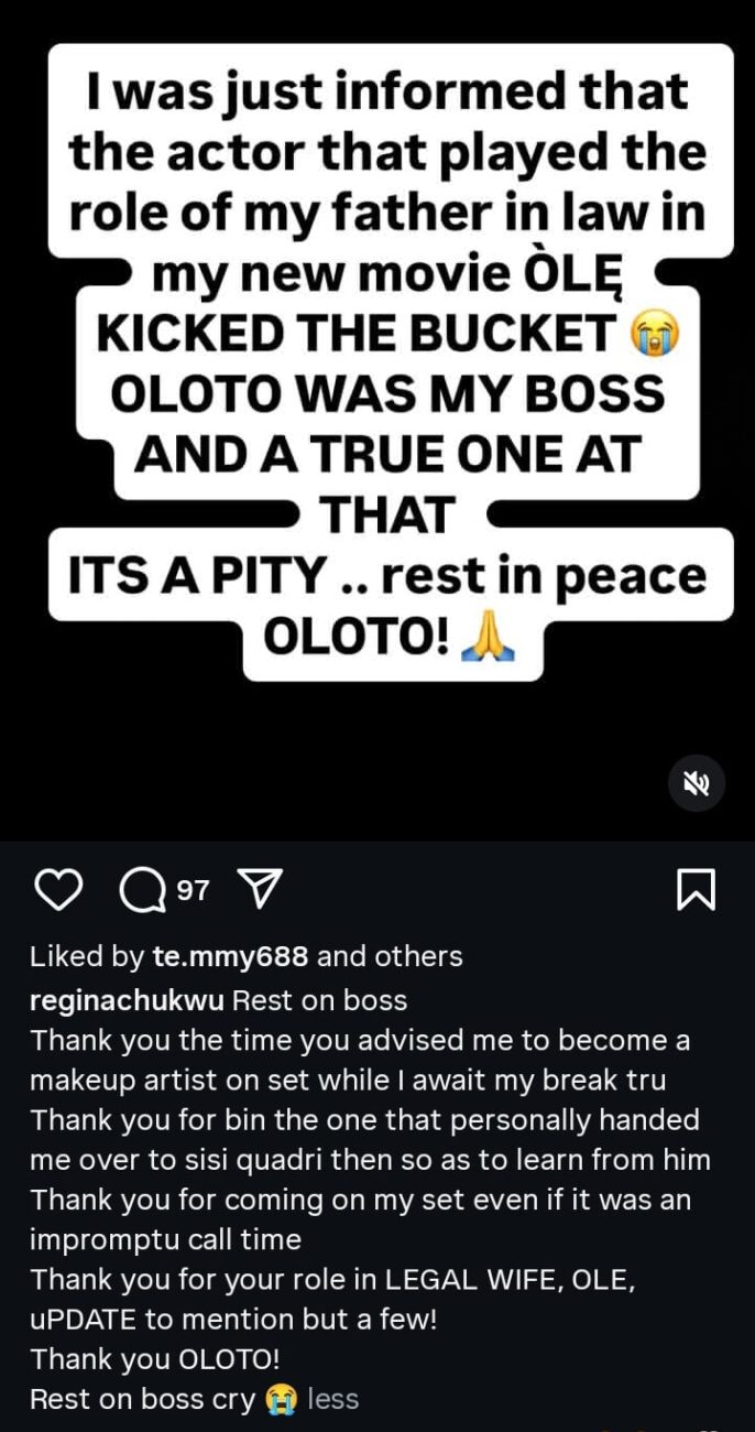Nollywood actress Regina Chukwu has announced the passing of veteran actor Oloto.