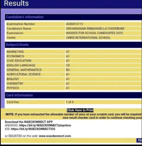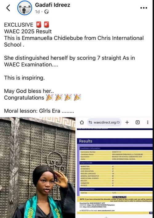 “WAEC 2025 Result. This is Emmanuella Chidiebube from Chris International School. She distinguished herself by scoring 7 straight As in WAEC Examination. This is inspiring. May God bless her. Congratulations. Moral lesson: Girls Era.”