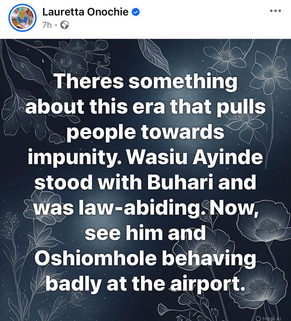 According to her, both Oshiomhole and Kwam 1 were law-abiding citizens during Buhari’s tenure, but under the current administration, they have been behaving improperly and acting with impunity at airports.