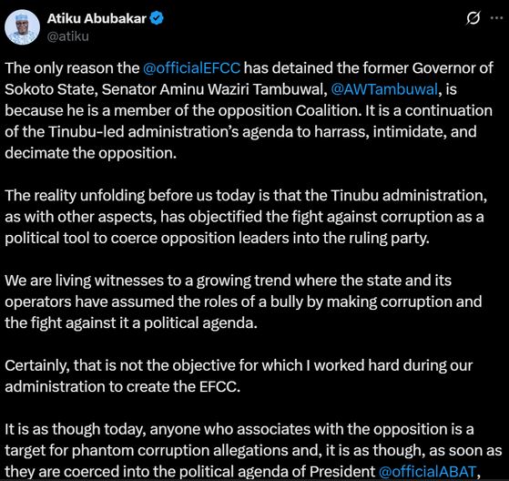 He tweeted: "The only reason the @officialEFCC has detained the former Governor of Sokoto State, Senator Aminu Waziri Tambuwal, @AWTambuwal, is because he is a member of the opposition Coalition. It is a continuation of the Tinubu-led administration’s agenda to harrass, intimidate, and decimate the opposition.
