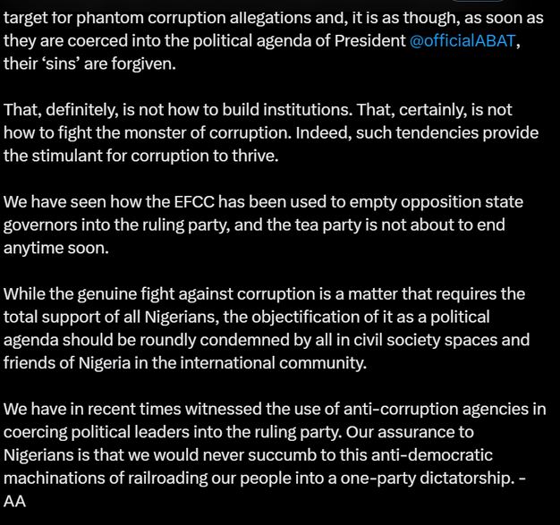 We have in recent times witnessed the use of anti-corruption agencies in coercing political leaders into the ruling party. Our assurance to Nigerians is that we would never succumb to this anti-democratic machinations of railroading our people into a one-party dictatorship. -AA"