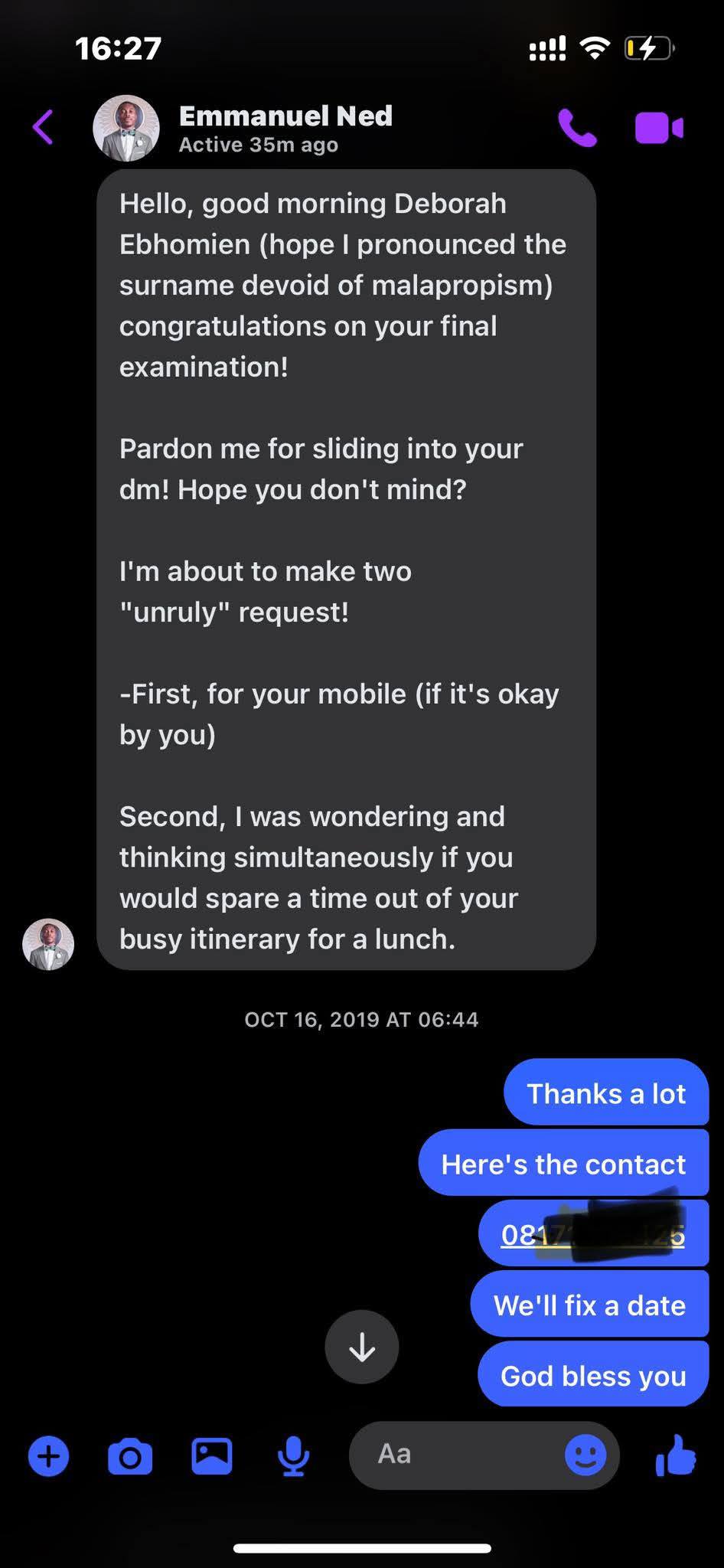 Emmanuel made the first move when he slid into Deborah's DM on October 16, 2019 to politely request for her phone number and a lunch date.