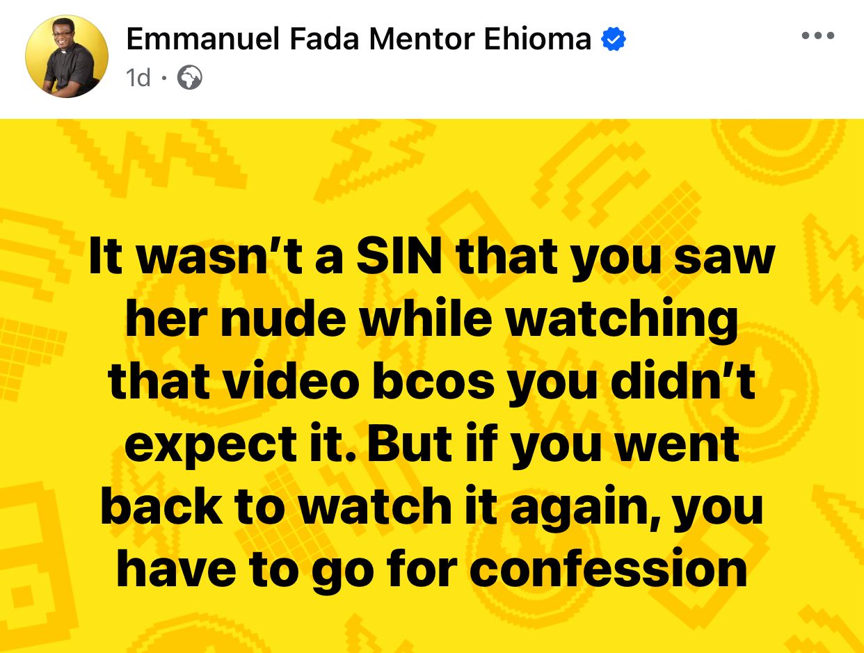 In a Facebook post shared on his page, Ehioma acknowledged that first time viewers of the video did not commit any sin because they did not expect what was coming but going back to watch it after getting acquainted with the nude content is a sin.