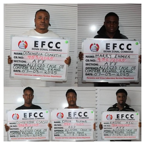 According to the statement, the convicts, Ayo Korede, Ogbemudia Osaretin, Harry Ehimien, Osasumwen Osahenator and Efosa Richard, were prosecuted on separate one-count charges, bordering on impersonation, obtaining by false pretence, retention of proceeds of crime and possession of fraudulent documents.