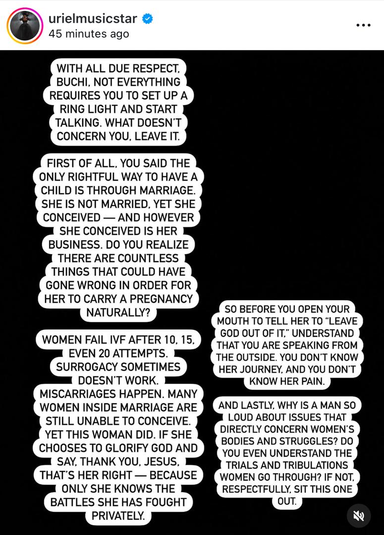 In response, Uriel shared a post on Instagram, asserting that Buchi has no right to comment on Toke’s pregnancy, as he is unaware of the challenges she may have faced that led to her decision to have the child.