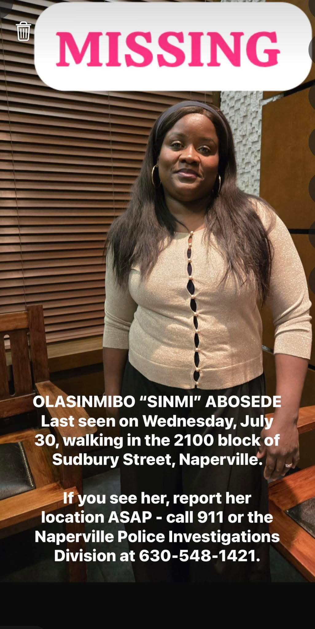 Olasinmibo "Sinmi" Abosede, a Nigerian woman who had been declared missing, has been found deceased in Naperville, Illinois, United States.
