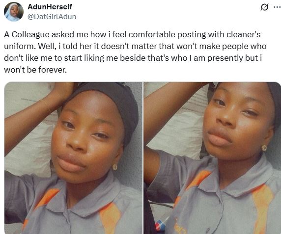 “Colleague asked me how I feel comfortable posting with a cleaner's uniform. Well, I told her it doesn't matter that won't make people who don't like me to start liking me. Beside that's who I am presently but I won't be forever,” she wrote in an post dated April 30, 2021.