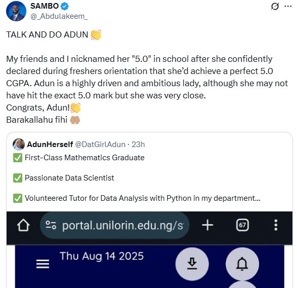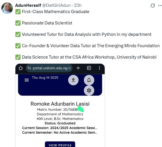 In a post on Saturday, August 16, 2025 she provided insight on how she went from being a cleaner to a graduate and data scientist.