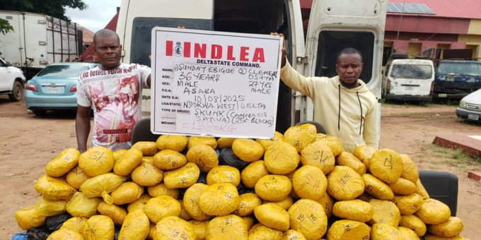 "However, acting on credible intelligence, NDLEA operatives in Delta swooped on him on Sunday, August 10, 2025, arresting him alongside his aide, 27-year-old Clement Osuya, as they attempted to move the illicit consignment for distribution,” the statement said.