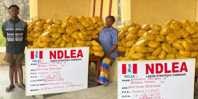 Operatives of the National Drug Law Enforcement Agency (NDLEA) have arrested a 52-year-old woman, Muyibat Mumuni, and her 25-year-old son, Faruk Mumuni, in Lagos for allegedly stockpiling and distributing 298 blocks of Ghana Loud cannabis, weighing a total of 149kg.