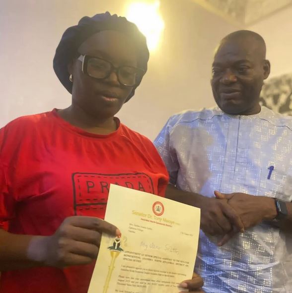 In a photo circulating online, Senator Nwoye was seen handing her an appointment letter.