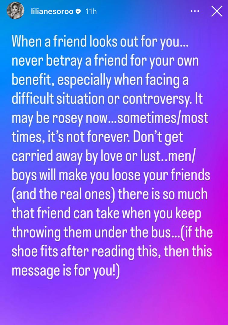 Actress Lilian Esoro has sent a message to an unnamed friend.
