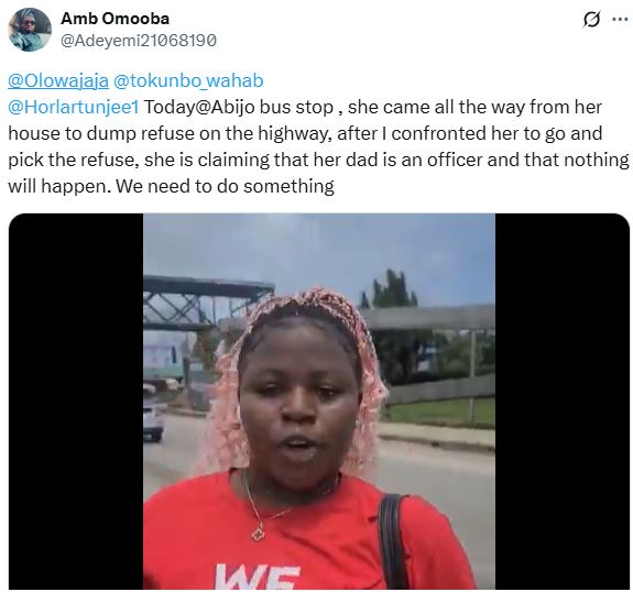 ‘’@Olowajaja @tokunbo_wahab @Horlartunjee1 Today@Abijo bus stop , she came all the way from her house to dump refuse on the highway, after I confronted her to go and pick the refuse, she is claiming that her dad is an officer and that nothing will happen. We need to do something''