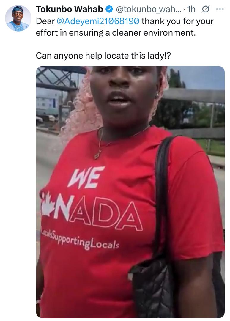 The Lagos state Commissioner for Environment and Water Resources, Tokunbo Wahab has begged the public to help him identify a young lady caught on tape dumping refuse on the road.