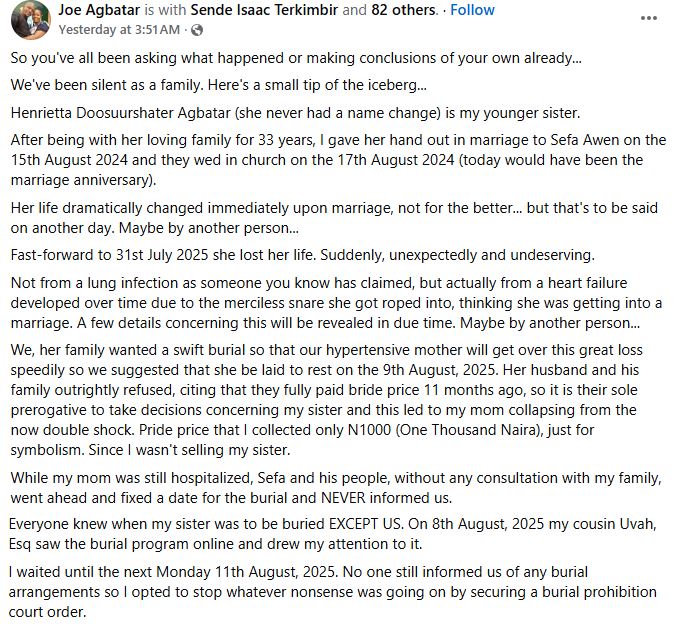 Speaking in a Facebook post on Sunday, August 17, 2025, Joe said his sister's husband, Sefa Awen, had claimed that Henrietta d!ed from a lung infection on July 31.