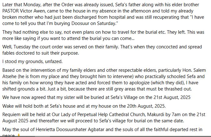 Later that Monday, after the Order was already issued, Sefa's father along with his elder brother PASTOR Victor Awen, came to the house in my absence in the afternoon and told my already broken mother who had just been discharged from hospital and was still recuperating that “I have come to tell you that I'm burying Doosuur on Saturday.”