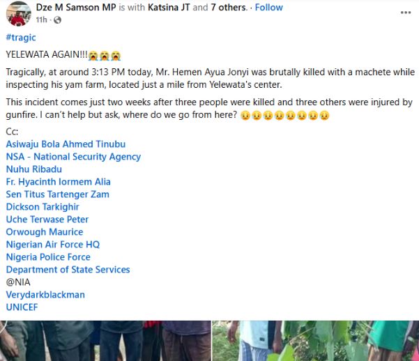 It was gathered that the victim, identified as Mr. Hemen Ayua Jonyi, was reportedly hacked to d3ath with a machete while attempting to access his yam farm located less than a mile from the village square.