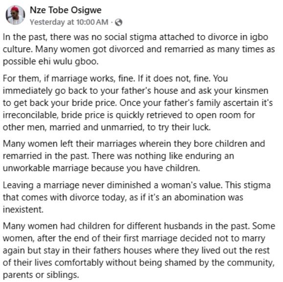 "In the past, there was no social stigma attached to divorce in Igbo culture. Many women got divorced and remarried as many times as possible ehi wulu gboo," he wrote.