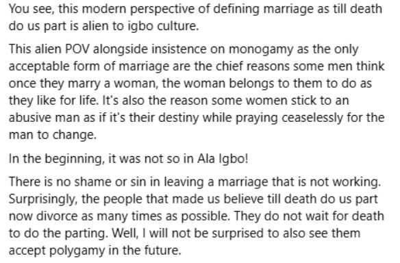 You see, this modern perspective of defining marriage as till death do us part is alien to Igbo culture. This alien POV alongside insistence on monogamy as the only acceptable form of marriage are the chief reasons some men think once they marry a woman, the woman belongs to them to do as they like for life. It's also the reason some women stick to an abusive man as if it's their destiny while praying ceaselessly for the man to change.
