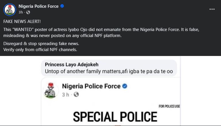 The statement reads, “FAKE NEWS ALERT! This ‘WANTED’ poster of actress Iyabo Ojo did not emanate from the Nigeria Police Force. It is false, misleading & was never posted on any official NPF platform. Disregard & stop spreading fake news.”