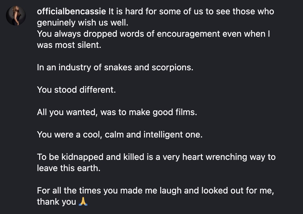 “In an industry of snakes and scorpions. You stood different. All you wanted, was to make good films. You were a cool, calm and intelligent one. To be kidnapped and killed is a very heart wrenching way to leave this earth. For all the times you made me laugh and looked out for me, thank you 🙏