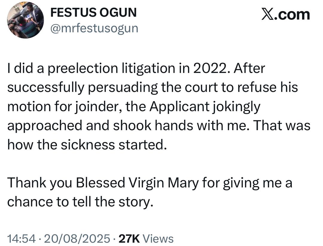 Another lawyer, Festus Ogun, left a comment recounting how he began to fall ill after a handshake with someone who filed a case against his client.