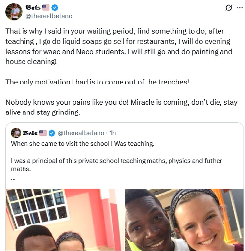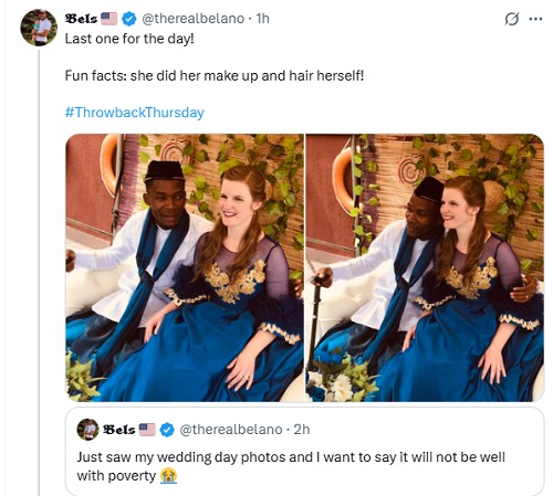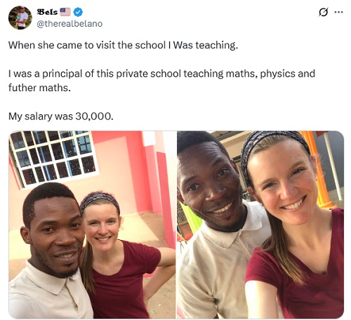 Belano opened up in a recent social media post that he was earning N30,000 monthly salary as a school principal and teacher while dating his American wife.