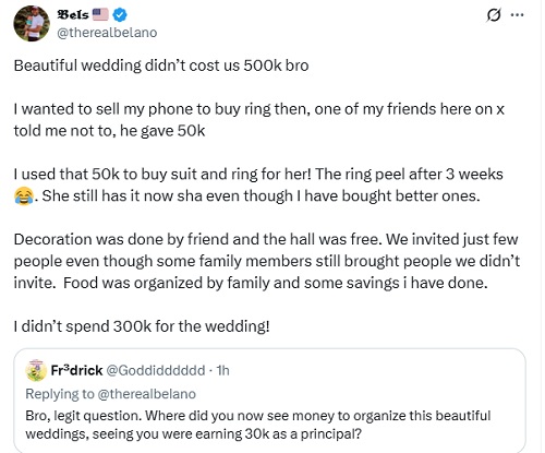 “Beautiful wedding didn’t cost us 500k bro. I wanted to sell my phone to buy ring then, one of my friends here on x told me not to, he gave 50k I used that 50k to buy suit and ring for her! The ring peel after 3 weeks . She still has it now sha even though I have bought better ones. Decoration was done by friend and the hall was free. We invited just few people even though some family members still brought people we didn’t invite. Food was organized by family and some savings I have done. I didn’t spend 300k for the wedding!,” he added.