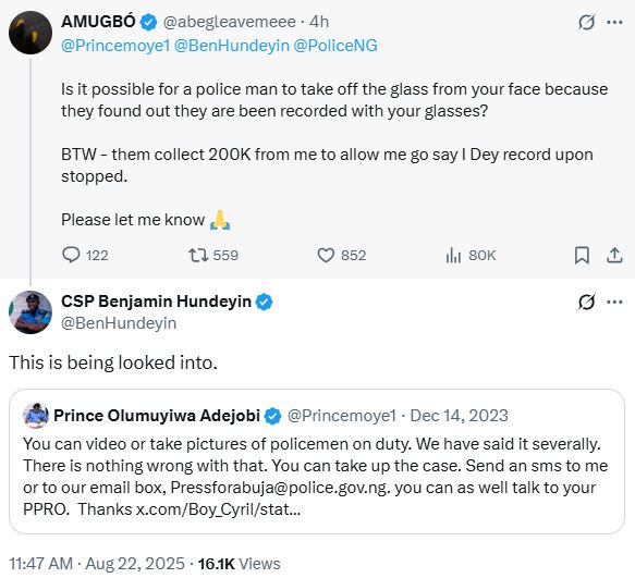 He retweeted a post from the spokesperson of the Nigeria Police Force, DCP Olumuyiwa Adejobi, where he stated that Nigerians are allowed to film officers on duty.