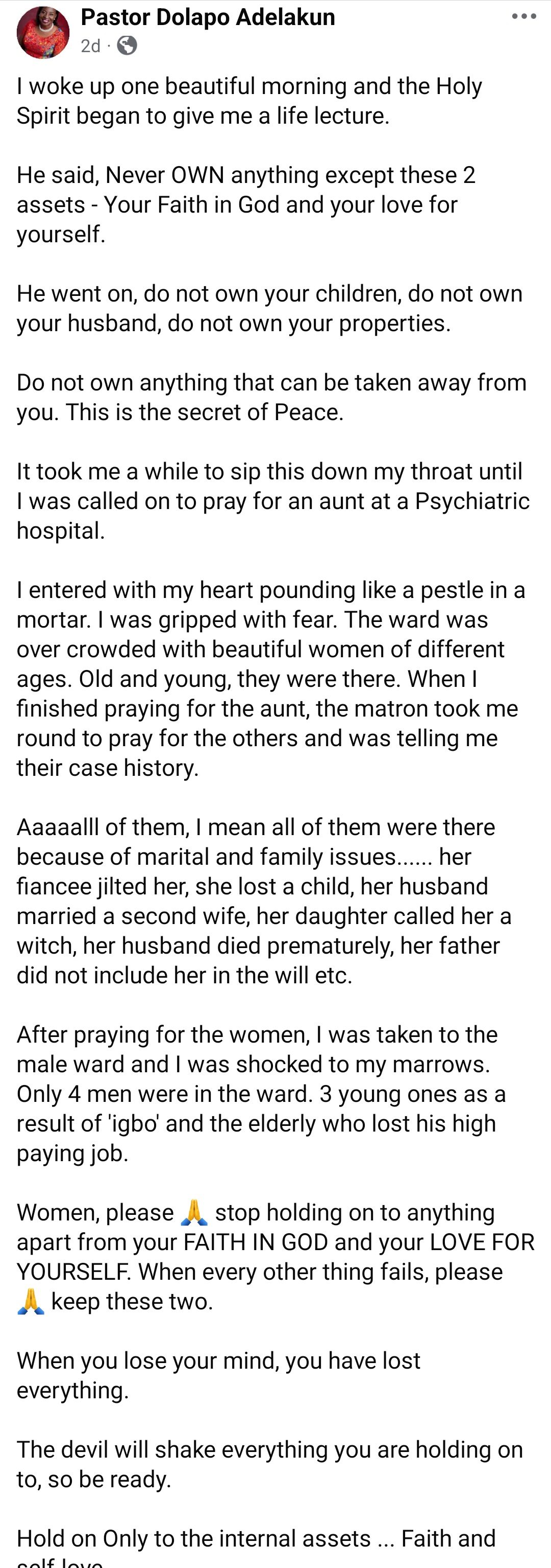 Pastor Dolapo Adelakun, a Nigerian cleric,has advised women to seek their peace in God alone while sharing her experience from a visit to a psychiatric hospital.