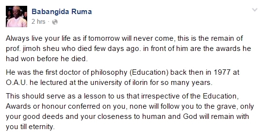 "Always live your life as if tomorrow will never come, this is the remain of prof. jimoh sheu who died few days ago. in front of him are the awards he had won before he died.