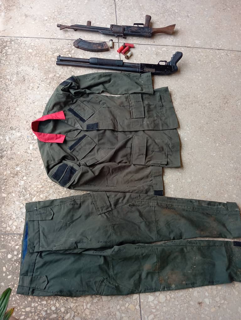 Nansel added that upon interrogation, Zomo led detectives to their hideout at Alagye village, Doma, where the following dangerous exhibits were recovered: One pump-action rifle, Breech No. P331551, one locally made AK-47 rifle with magazine, two live ammunition and five cartridges, one knife and a rope, two Tecno handsets, a pair of NSCDC uniforms.