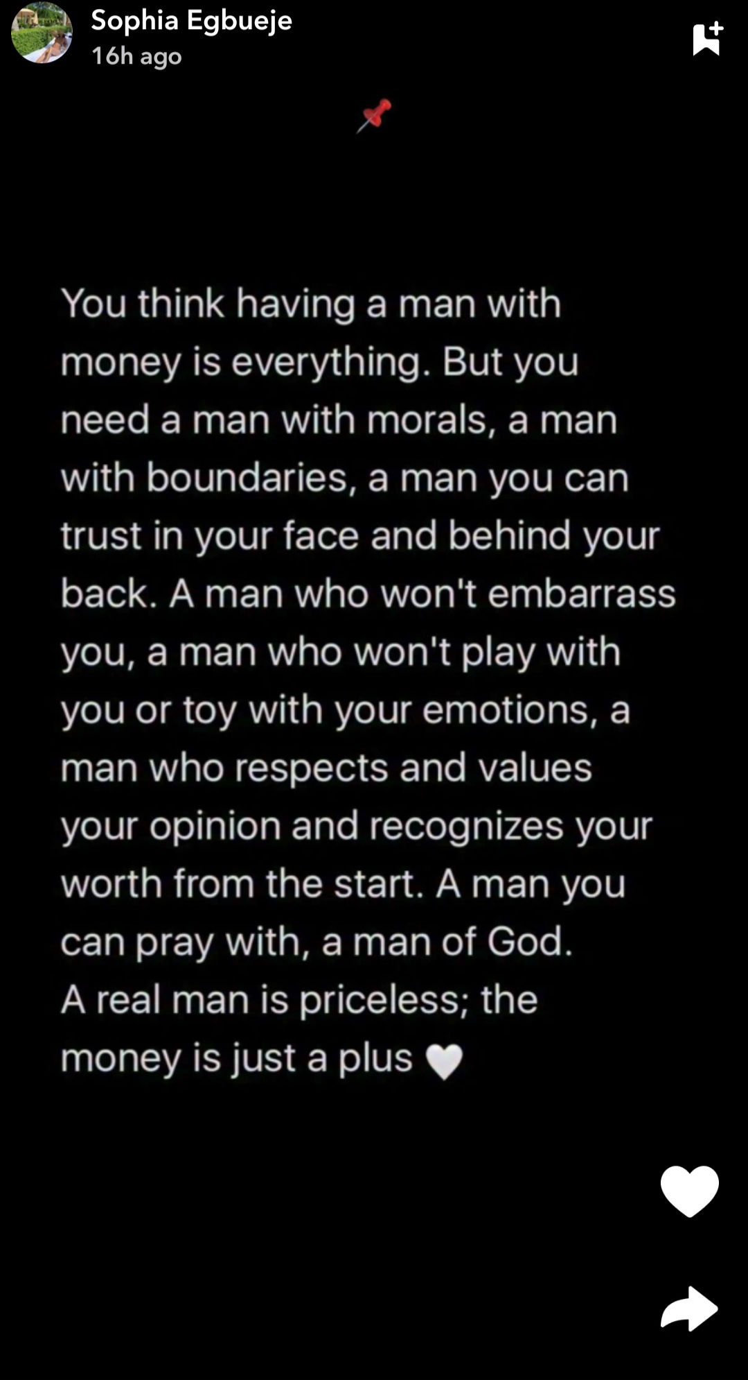 She wrote: "You think having a man with money is everything. But you need a man with morals, a man with boundaries, a man you can trust in your face and behind your back.