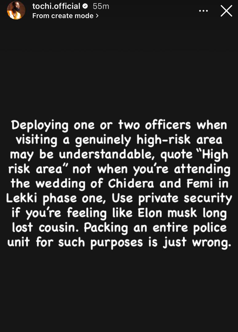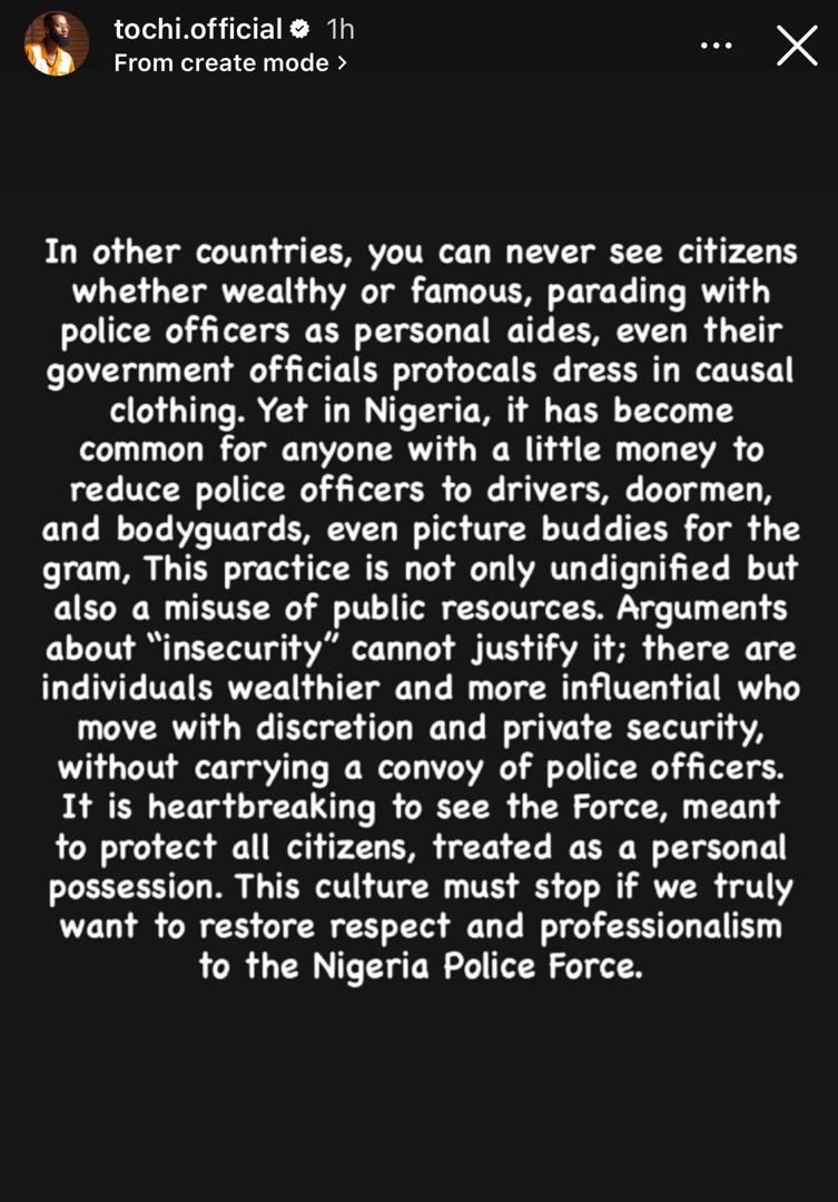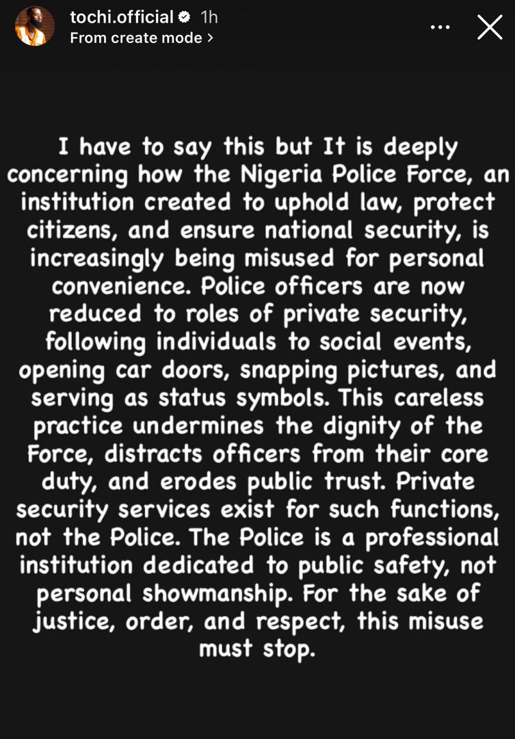 He took to Instagram to lament that the Nigeria Police Force created to uphold law, protect citizens, and ensure national security has now been “reduced to roles of private security, following individuals to social events, opening car doors, snapping pictures, and serving as status symbols. “