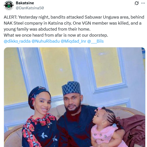 “Yesterday night, bandits attacked Sabuwar Unguwa area, behind NAK Steel company in Katsina city. One VGN member was k!lled, and a young family was abducted from their home. What we once heard from afar is now at our doorstep,” he wrote.