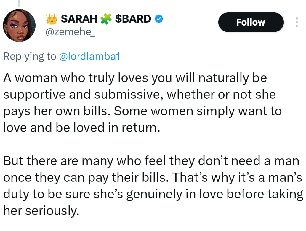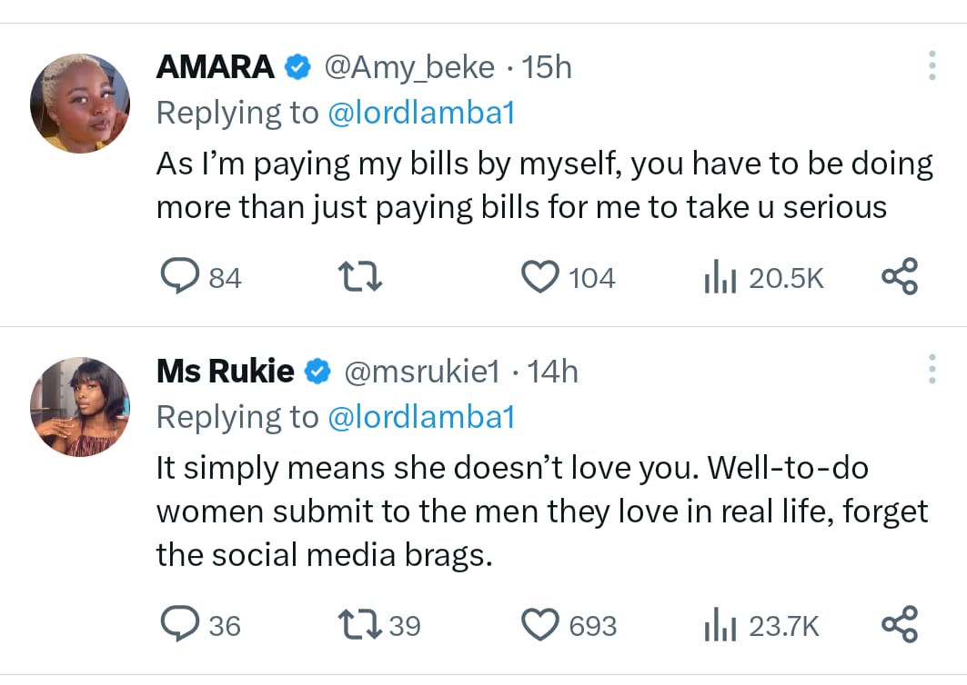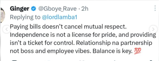 One user replied: “Paying bills doesn’t cancel mutual respect. Independence is not a license for pride, and providing isn’t a ticket for control. Relationship na partnership not boss and employee vibes.”