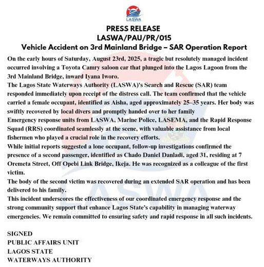 The Lagos State Waterways Authority (LASWA) has confirmed the recovery of a second victim after a Toyota Camry saloon car somersaulted and plunged into the Lagos Lagoon from the Third Mainland Bridge, heading toward Iyana Iworo.